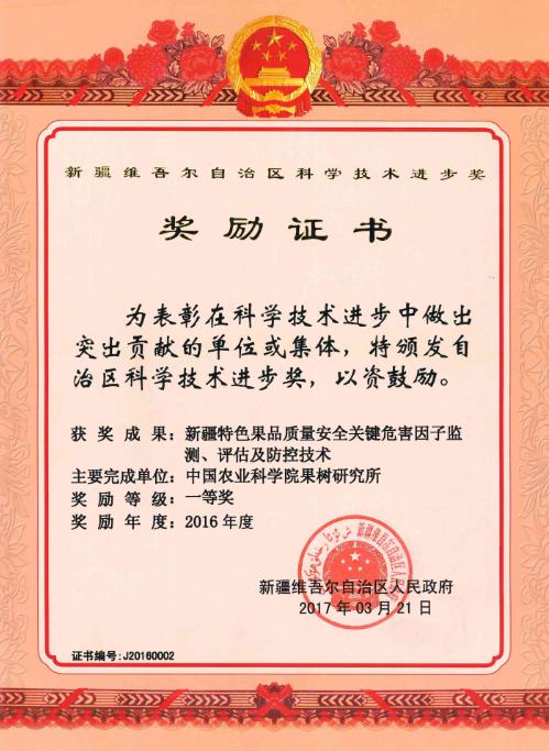 “果品质量安全风险监测与评估团队”在果品质量安全风险监测、风险评估、营养功能评价等方面均取得可喜进展,建立了果品及其制品中植物生长调节剂氯吡脲、杀菌剂代森锰锌和真菌毒素的快速、高效检测技术,明确了苹果中手性农药噁唑菌酮的立体选择性降解行为、梨中腈苯唑残留消解动态、桃农药残留膳食暴露风险和干果真菌毒素污染风险。